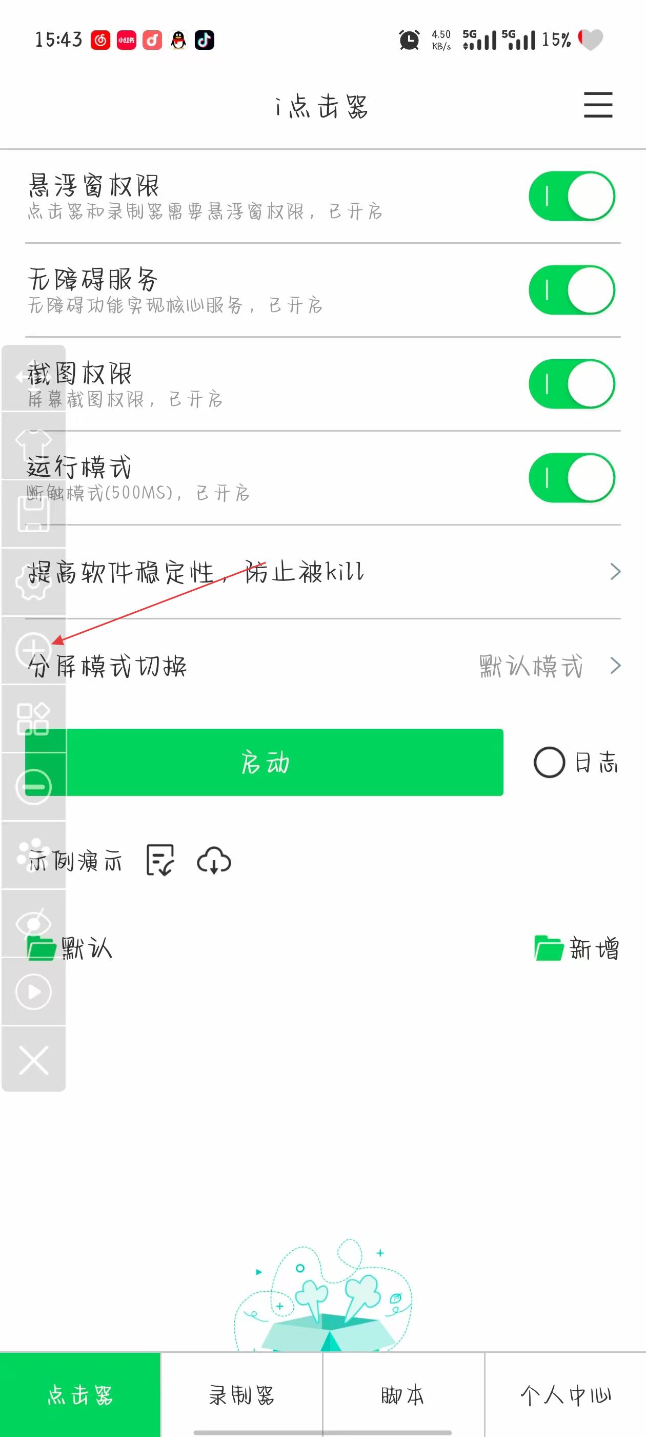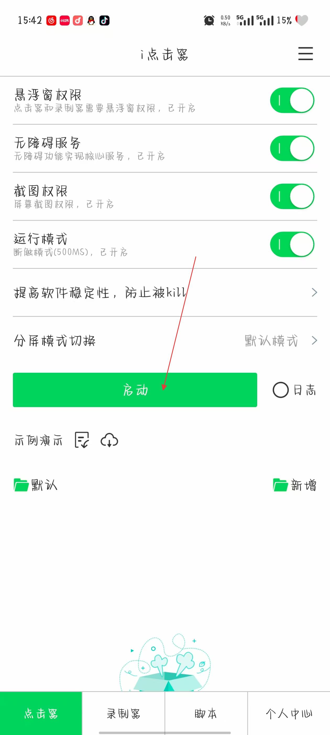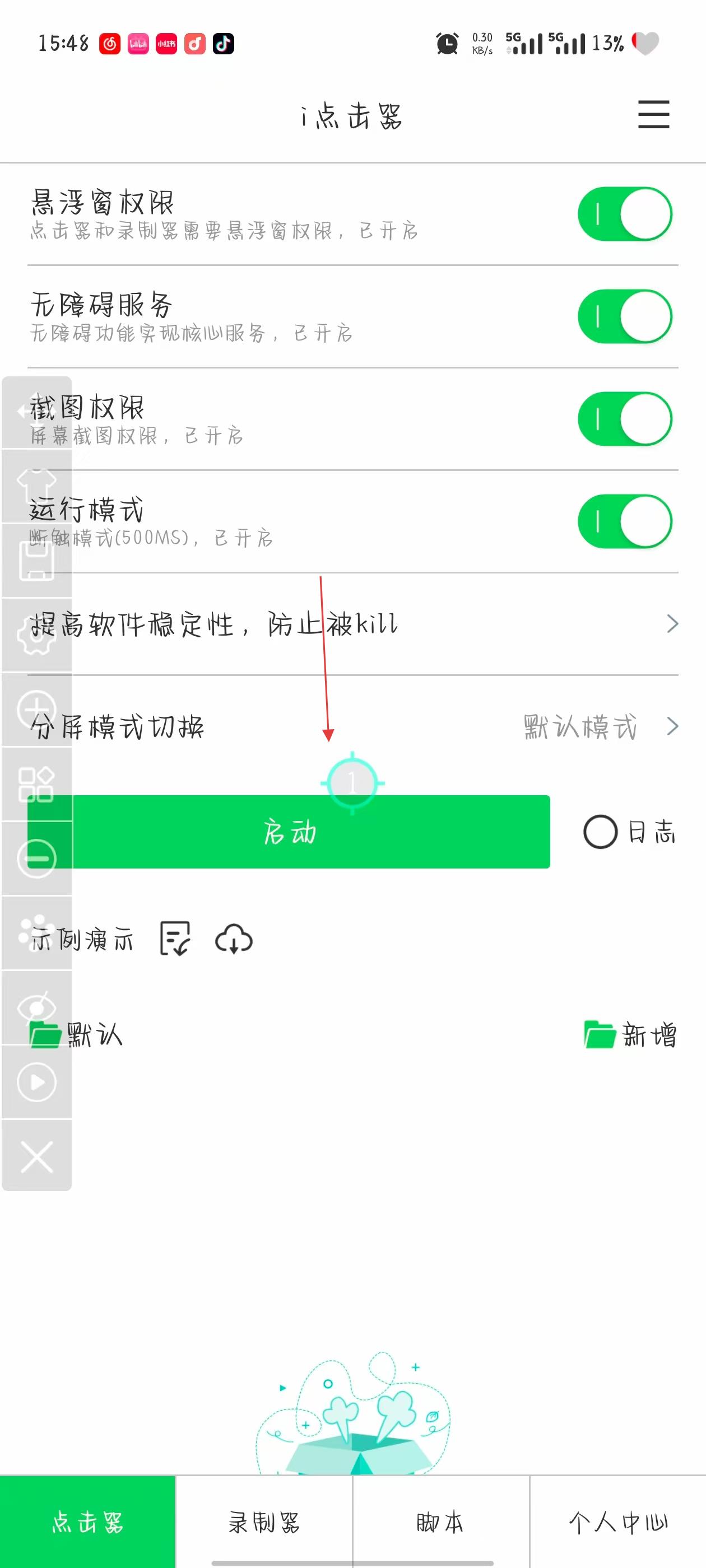 1、打開i點(diǎn)擊器應(yīng)用,確認(rèn)懸浮窗權(quán)限、無障礙服務(wù)、截圖權(quán)限均已開啟,點(diǎn)擊界面中的啟動按鈕。