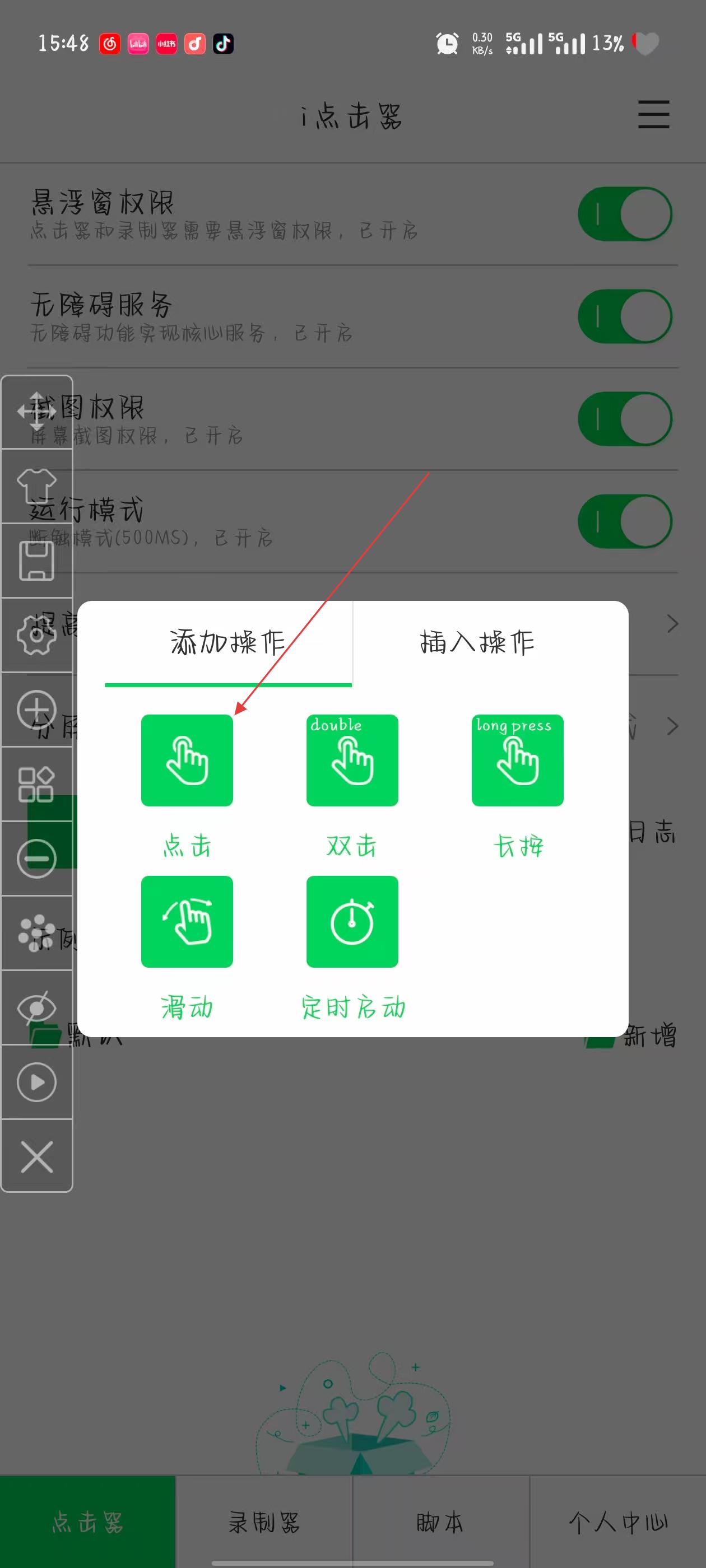3、在左側(cè)功能操作欄中點(diǎn)擊+圖標(biāo),可選擇點(diǎn)擊,雙擊,長按,滑動,定時啟動等操作類型。