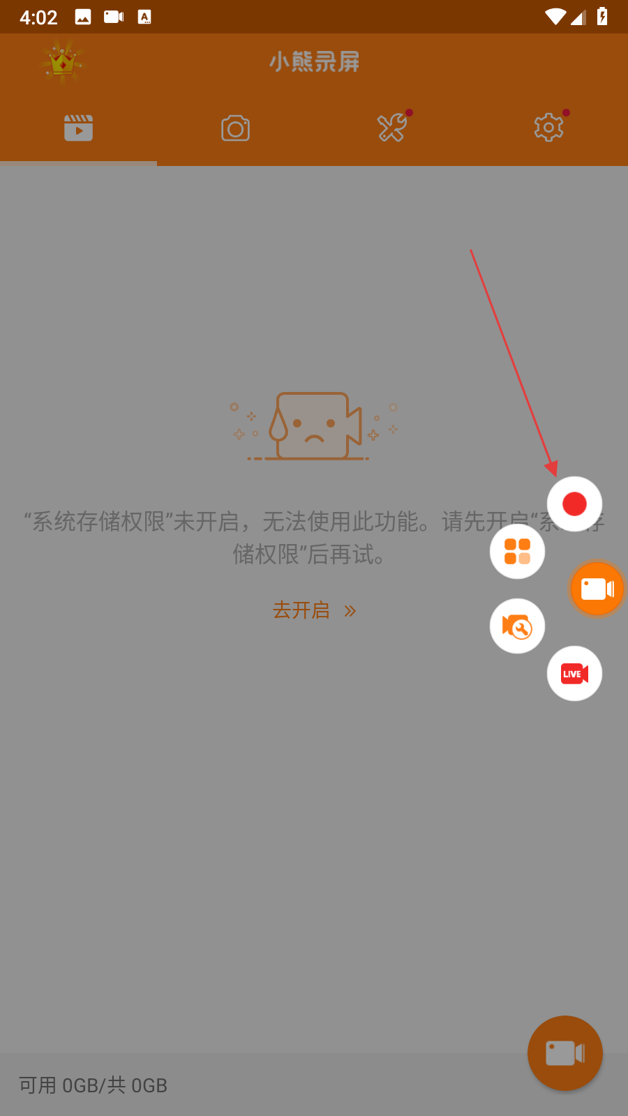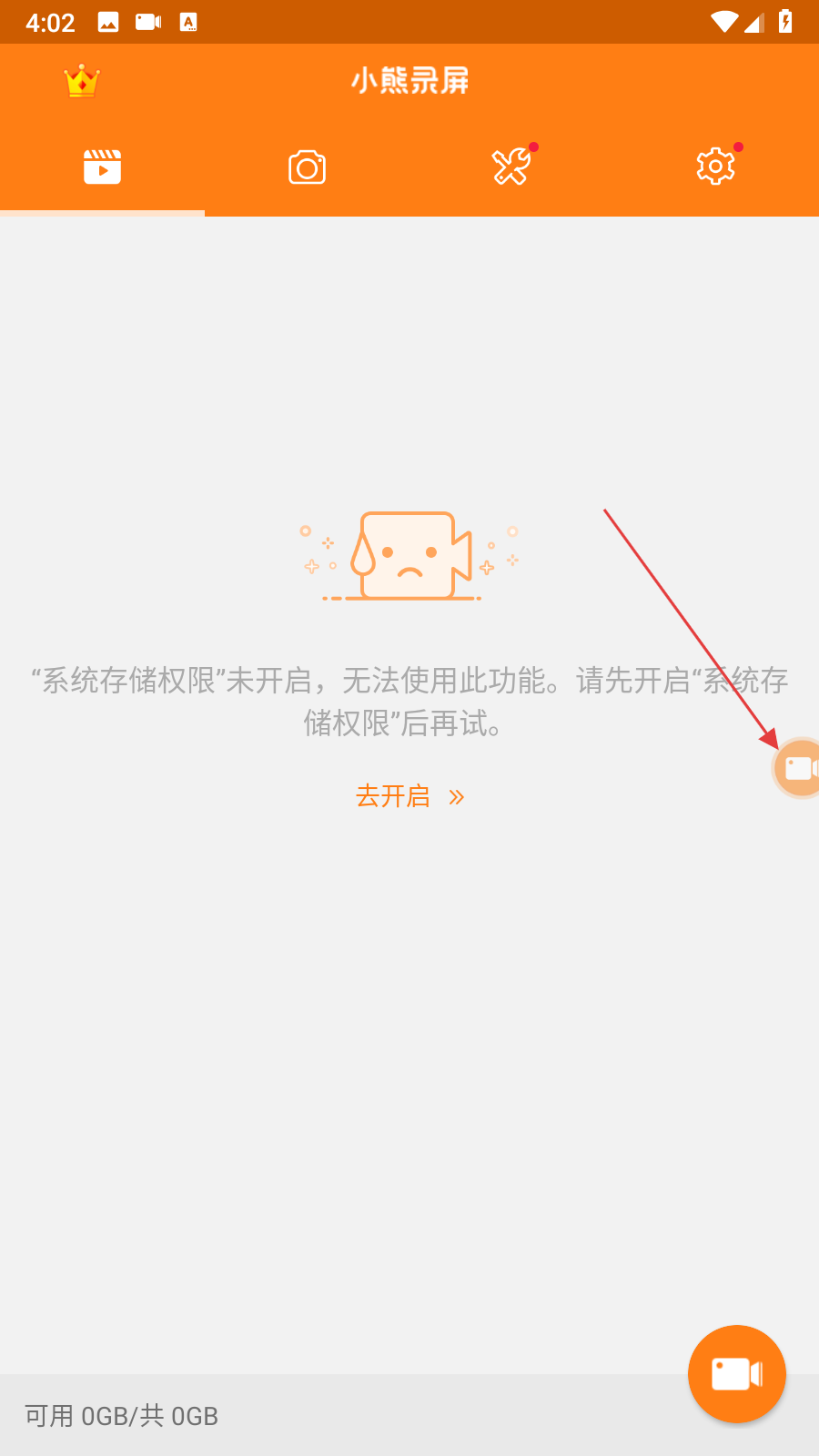 1、打開小熊錄屏應用,點擊右邊隱藏著的橙色攝像機圖標。