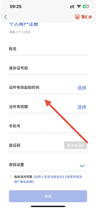 4、在信息填寫頁(yè)面依次輸入個(gè)人信息,設(shè)置密碼并同意協(xié)議后,點(diǎn)擊完成即可完成個(gè)人注冊(cè)。