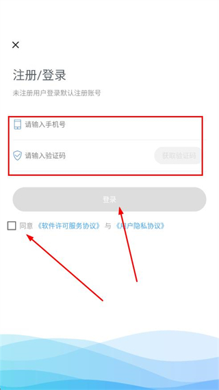 2、在注冊/登錄頁面輸入手機號、驗證碼,勾選協議后,點擊登錄,未注冊用戶將默認注冊賬號。
