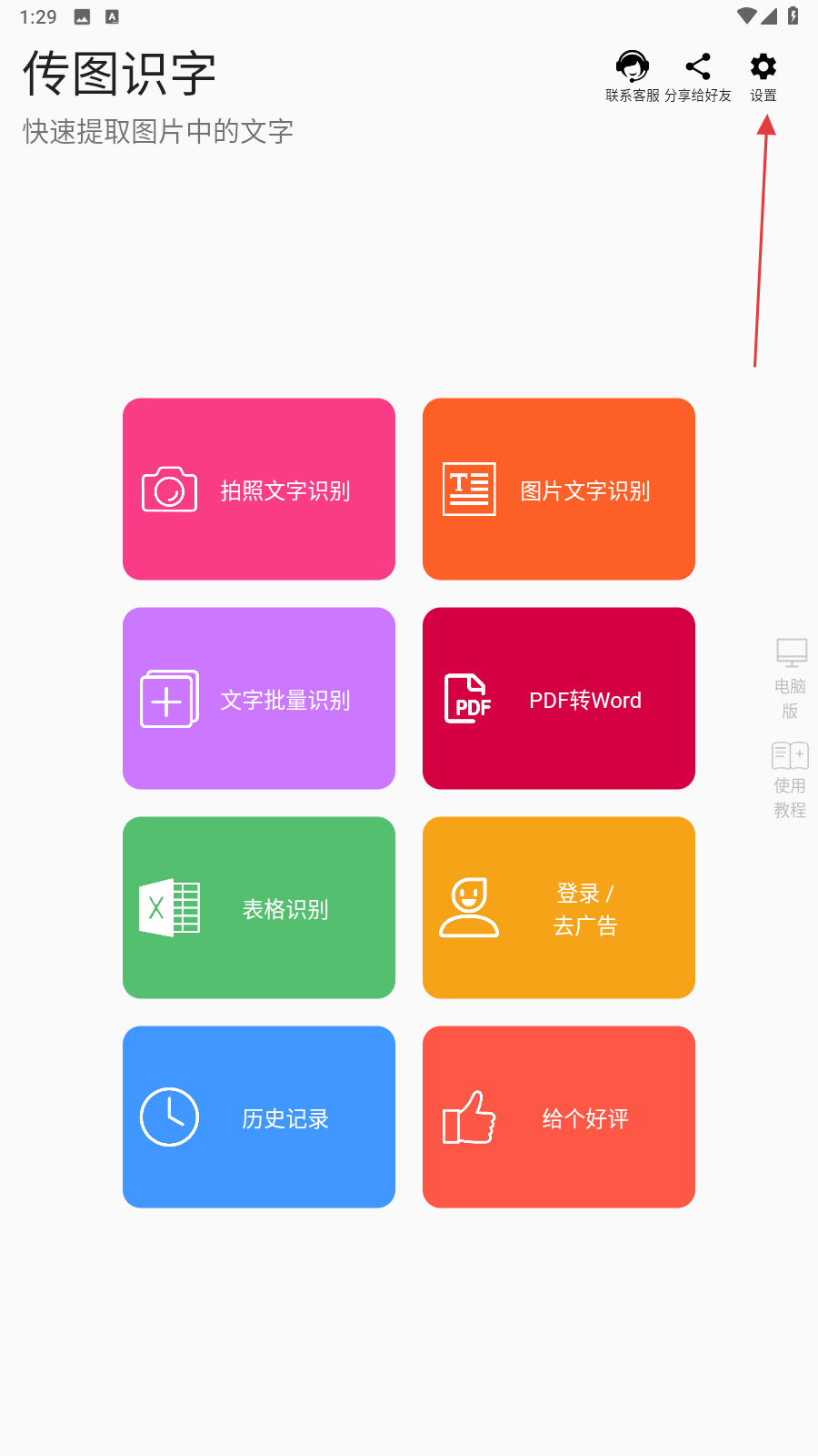 1、打開傳圖識(shí)字APP,在首頁內(nèi)點(diǎn)擊右上齒輪狀設(shè)置的圖標(biāo)。
