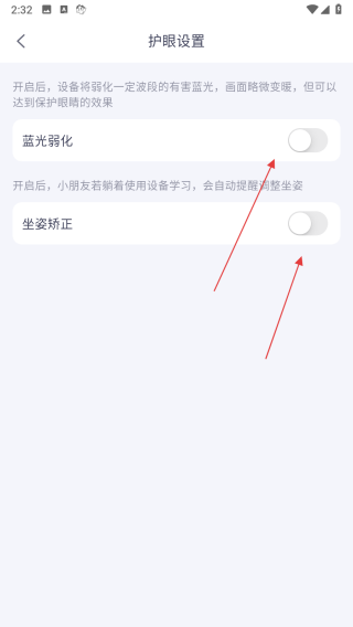 4、在護眼設(shè)置頁面,點擊藍光弱化或坐姿矯正對應(yīng)的開關(guān)按鈕,即可開啟相應(yīng)的護眼功能。