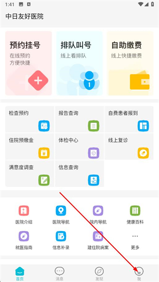1、打開(kāi)中日友好醫(yī)院app,點(diǎn)擊底部導(dǎo)航欄中的我選項(xiàng)。
