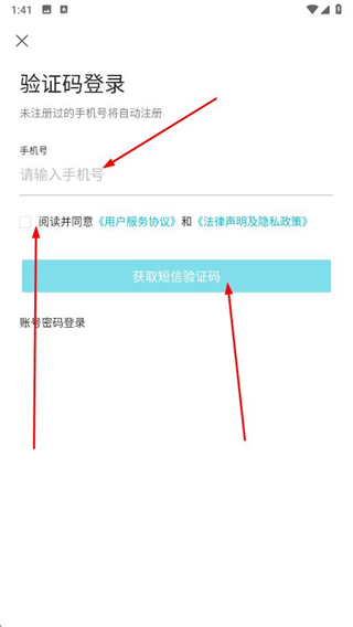 2、在驗(yàn)證碼登錄頁(yè)面,輸入手機(jī)號(hào),勾選服務(wù)協(xié)議和隱私政策,點(diǎn)擊獲取短信驗(yàn)證碼。