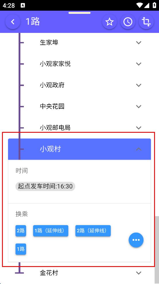 4、繼續(xù)在1路公交詳情頁面,向下瀏覽,能查看各站點信息,包括小觀村等站點的發(fā)車時間、可換乘的公交路線等內(nèi)容。