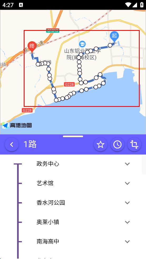 3、在1路公交詳情頁面,可查看該公交的行駛路線地圖,地圖上會顯示起點、途經(jīng)站點以及終點的位置分布。