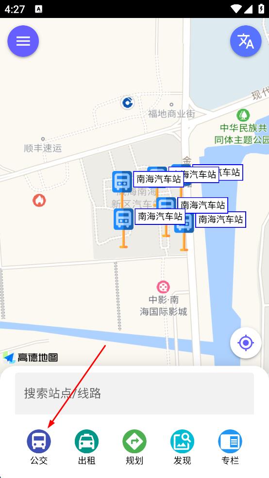 1、打開公交查詢軟件,進入地圖頁面后,點擊底部的“公交”選項,進入公交線路頁面。