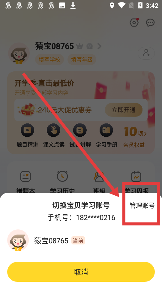 2、在彈出的選項中,點擊管理賬號,進入寶貝學習賬號管理頁面。