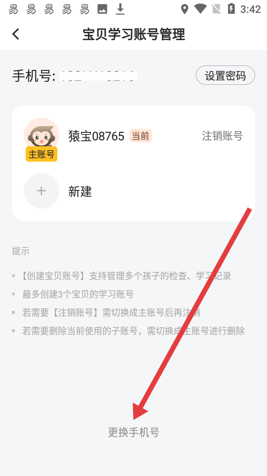 3、在寶貝學習賬號管理頁面,點擊下方的更換手機號,然后按照頁面提示,完成更換手機號的操作。