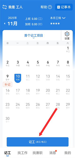 1、打開(kāi)記工APP,點(diǎn)擊記工按鈕,進(jìn)入我是工人,開(kāi)始記工頁(yè)面。