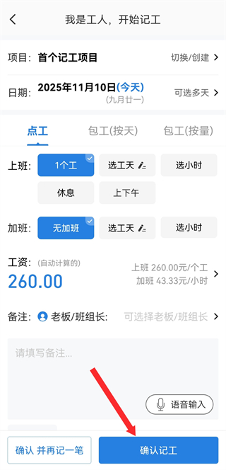 2、在頁(yè)面選擇記工類型,設(shè)置信息,填寫(xiě)備注后點(diǎn)擊確認(rèn)記工。