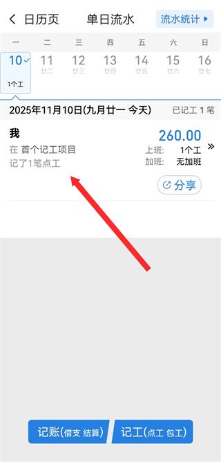 3、記工完成后,我們可以在單日流水的頁(yè)面查看記工記錄。