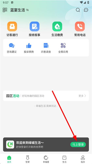 1、打開綠城生活app,在首頁找到馬上登錄按鈕并點擊。