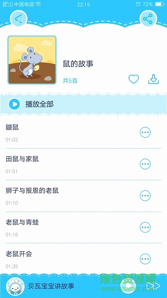 貝瓦故事是一款幼兒故事app。這款app有大量的童話教育故事,而且是語(yǔ)音版本的,這就是說(shuō)家長(zhǎng)只需要將這款app放在孩子旁邊設(shè)置好定時(shí)功能就可以代替父母給孩子講睡前故事了。這些故事都是精挑細(xì)選的一些早教類(lèi)型的小故事非常具有教育性和益智性,想要來(lái)體驗(yàn)一下就快來(lái)綠色資源網(wǎng)下載吧。