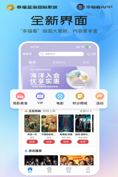 幸???幸福藍海app)是一款電影票訂購軟件,由江蘇幸福藍海影院官方打造的一款手機客戶端軟件。軟件界面清晰,功能強大,可查詢到幸福藍海旗下所有影院實時排期、票價及影院的交通路線。還支持GPS定位功能,附近影院全知道,提前在線選擇最佳觀影位置,讓您足不出戶購買電影票,省去排隊煩惱。簡單易用,更多優(yōu)惠,盡在幸???,一切盡在掌握。更有豐富優(yōu)惠活動等您參與,精彩不容錯過!幸福看,打造您的觀影新體驗。