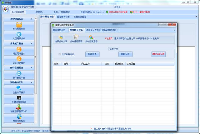 信息蟲WIN7版是一款將網(wǎng)絡營銷一鍵式推廣引擎可以快速將企業(yè)產品信息直接推向互聯(lián)網(wǎng)市場的站長網(wǎng)絡推廣平臺,并且使用這款軟件你可以輕松的管理自己的網(wǎng)站,一鍵搞定非常方便。趕快下載吧?。?!