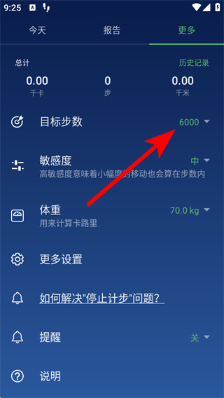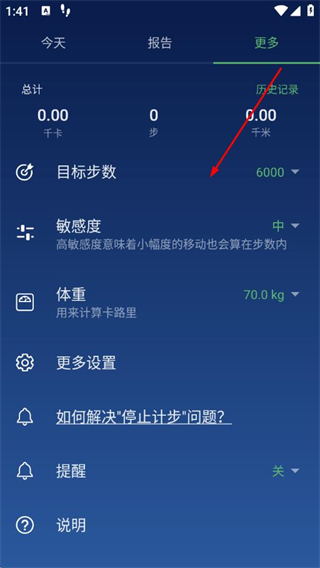 3、支持調(diào)整目標(biāo)步數(shù)、計(jì)步敏感度,還可設(shè)置體重參數(shù),此外還有提醒、歷史記錄等輔助功能。
