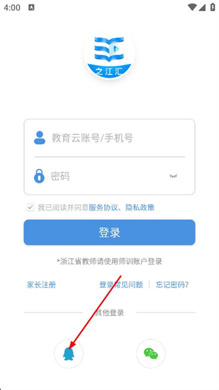 1、打開之江匯APP,在登錄頁面點(diǎn)擊QQ登錄圖標(biāo)。