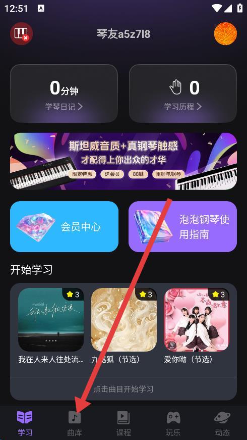 1、打開泡泡鋼琴,點(diǎn)擊底部導(dǎo)航欄中的曲庫(kù)選項(xiàng)。