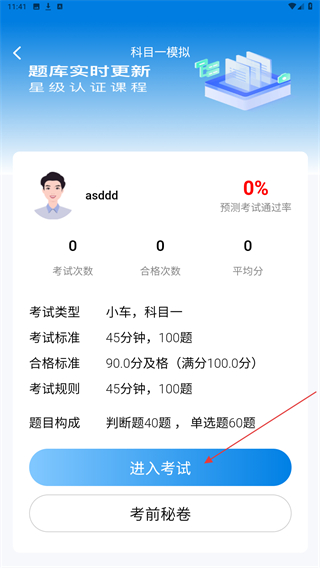 2、進(jìn)入科目一模擬的頁面內(nèi),點擊下方進(jìn)入考試的按鈕。