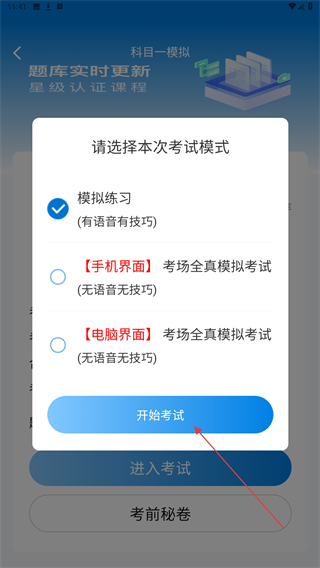 3、在選擇的界面內(nèi),選擇模擬練習(xí)并點擊開始考試。