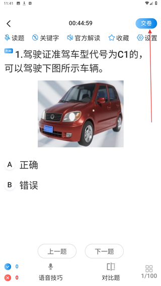 4、進(jìn)入考試的頁面內(nèi),答完題后點擊右上方交卷即可。