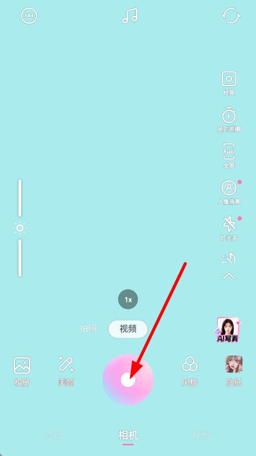 3、調(diào)整好拍攝角度和所需的美顏、風格等效果后,點擊拍攝界面中的圓形拍攝按鈕,開始錄制視頻,錄制完成后再次點擊該按鈕即可停止錄制。