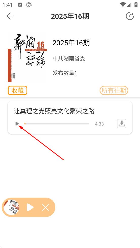 4、點(diǎn)擊后進(jìn)入到該有聲期刊的播放頁面,可查看期刊相關(guān)信息,點(diǎn)擊播放按鈕,即可開始收聽有聲期刊內(nèi)容。