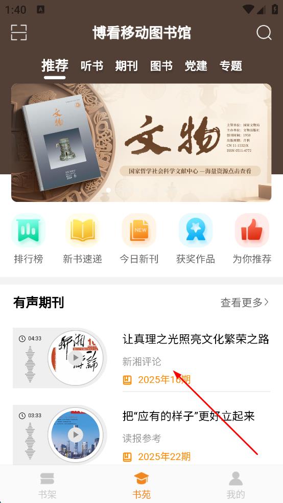 3、在博看移動(dòng)圖書館主界面,找到“有聲期刊”板塊,選擇一篇有聲期刊,點(diǎn)擊該有聲期刊。