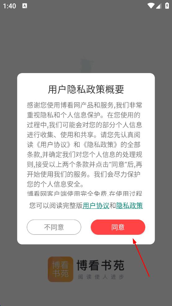 1、打開博看書苑應(yīng)用,彈出“用戶隱私政策概要”提示框,點(diǎn)擊“同意”,進(jìn)入到聽書欄目介紹頁面。