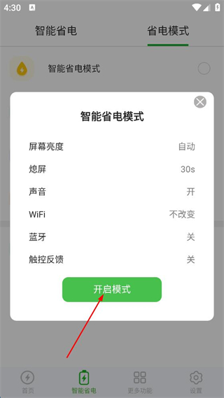 4、在彈出的智能省電模式確認(rèn)框中,點(diǎn)擊開啟模式按鈕。