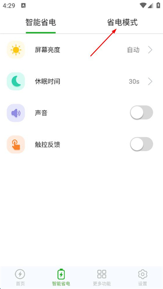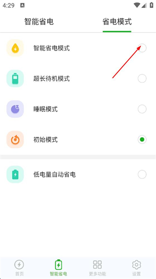 2、進(jìn)入智能省電界面,點(diǎn)擊右上角省電模式選項(xiàng)。