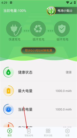 1、打開電池管理軟件首頁,點(diǎn)擊底部智能省電選項(xiàng)。