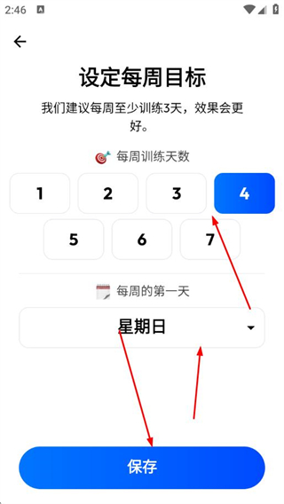 2、在設(shè)定每周目標頁面,選擇每周訓(xùn)練天數(shù),設(shè)置每周的第一天。點擊保存。