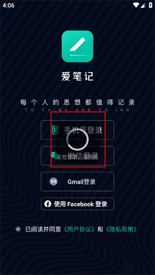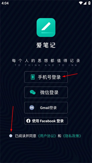 1、打開愛筆記軟件,勾選已閱讀并同意用戶協(xié)議和隱私政策,點(diǎn)擊手機(jī)號(hào)登錄。