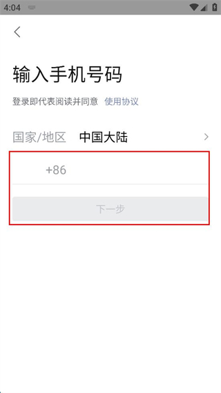2、進(jìn)入輸入手機(jī)號(hào)碼界面,在+86后輸入手機(jī)號(hào)碼,點(diǎn)擊下一步。
