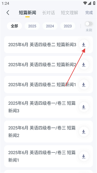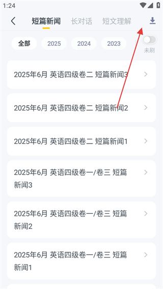 3、進入聽力真題頁面后,點擊右上角的下載圖標,喚起下載功能。