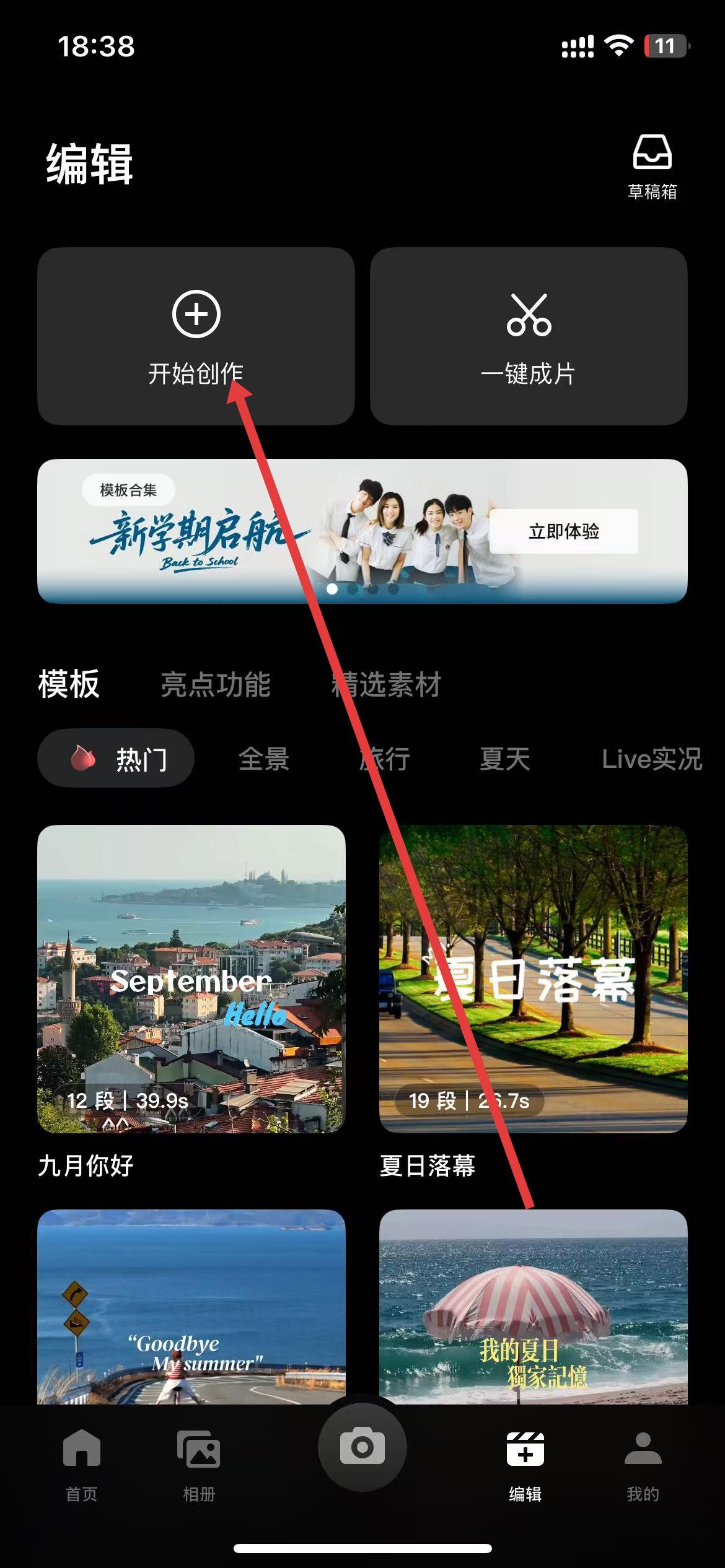1、打開DJI Mimo,在編輯頁面點(diǎn)擊上方的開始創(chuàng)作。