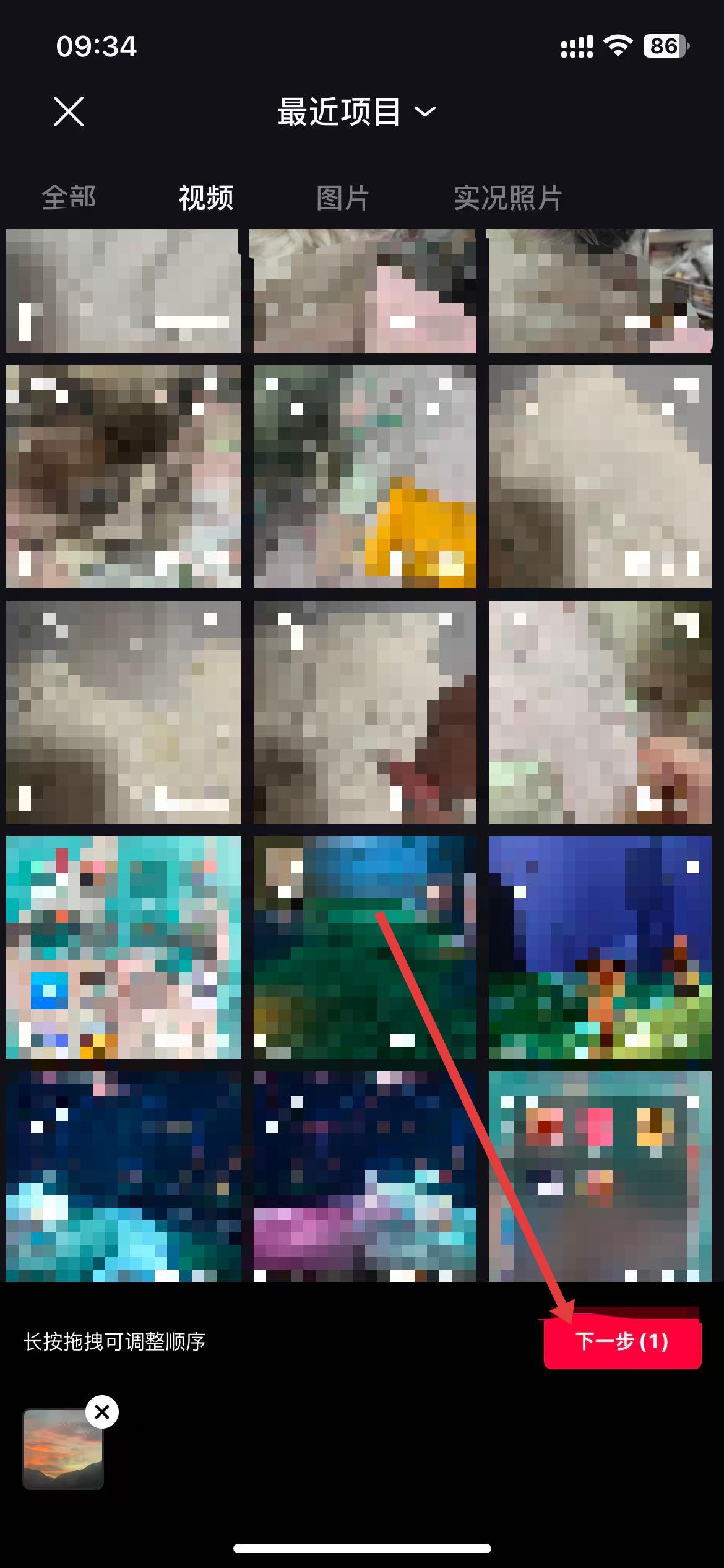 2、選擇需要添加音頻的視頻,點(diǎn)擊下一步。