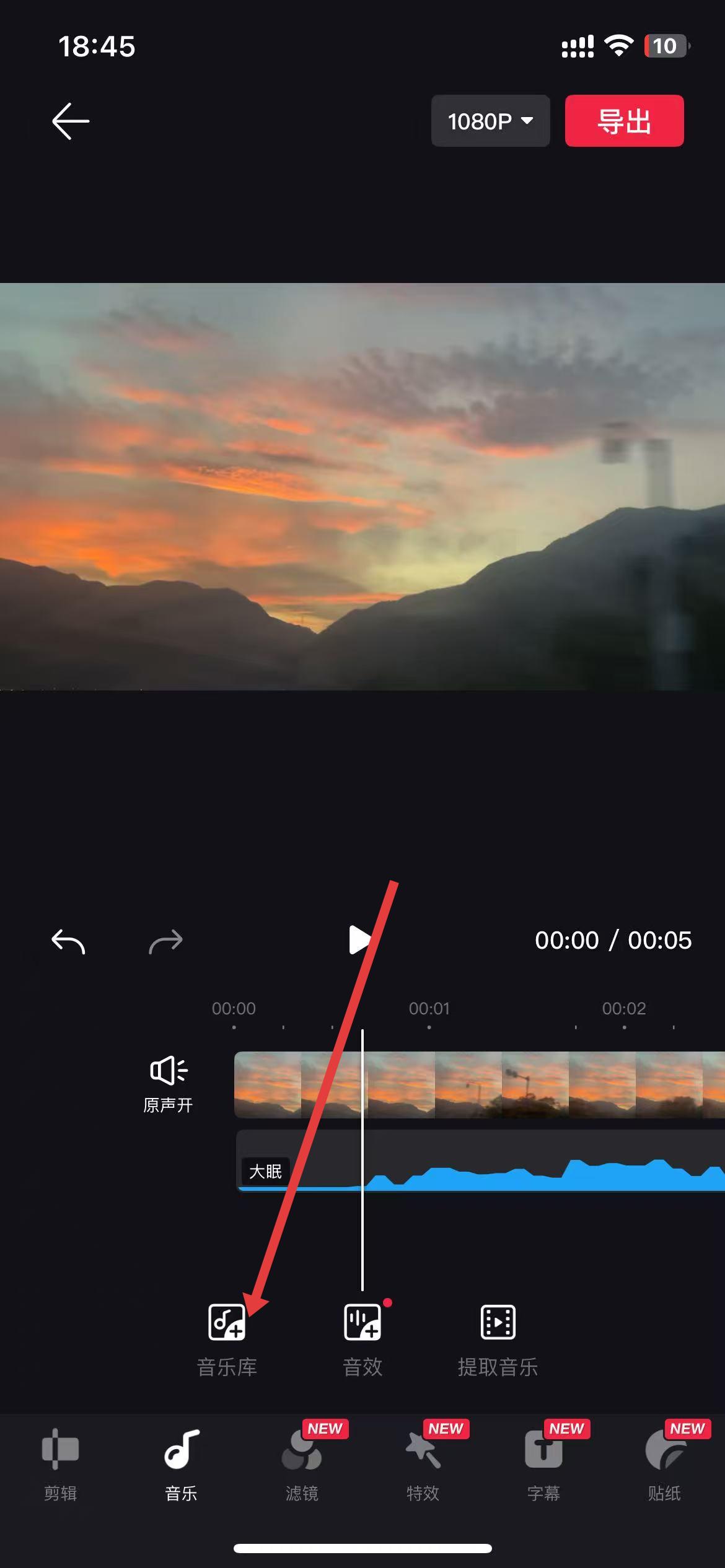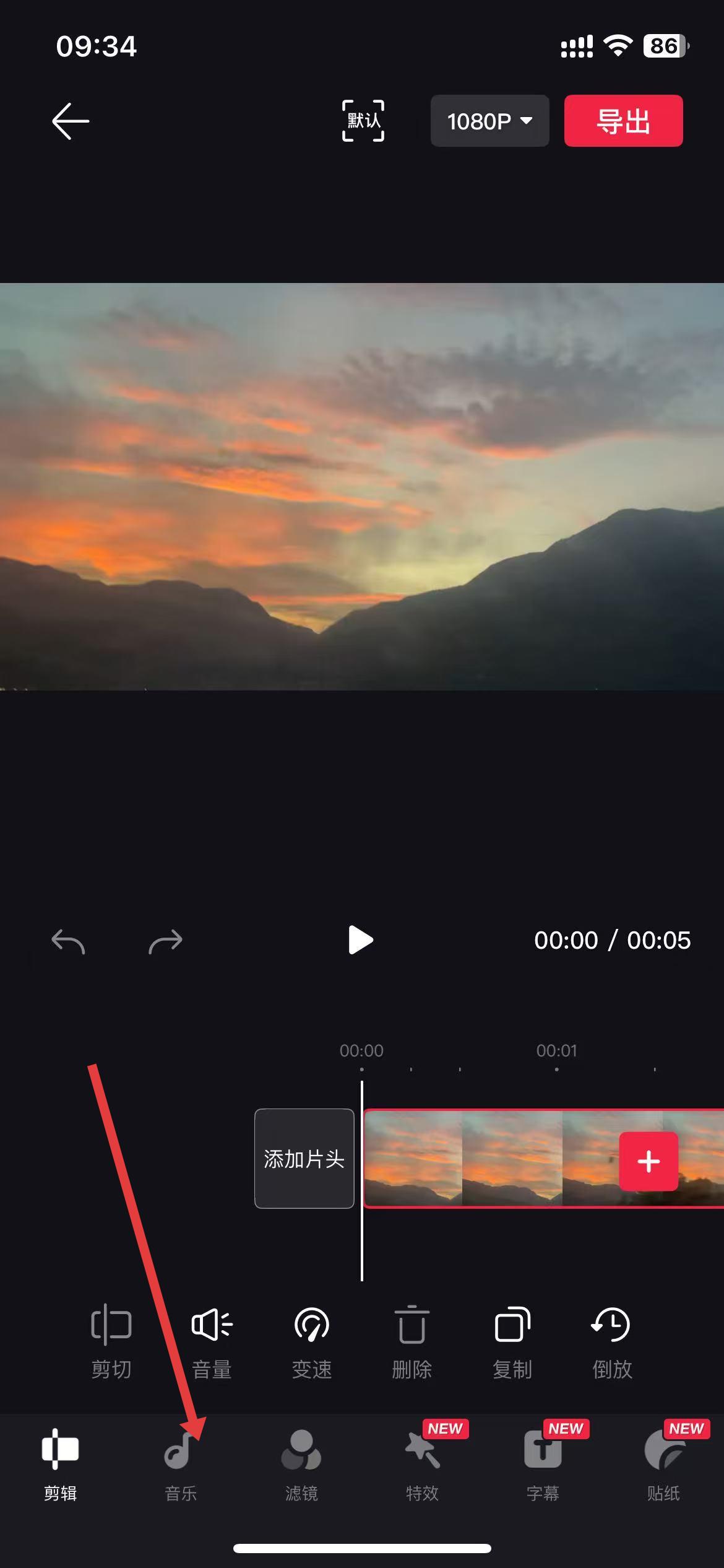 3、進(jìn)入視頻編輯頁,點(diǎn)擊底部音樂選項(xiàng),進(jìn)入音樂操作界面。
