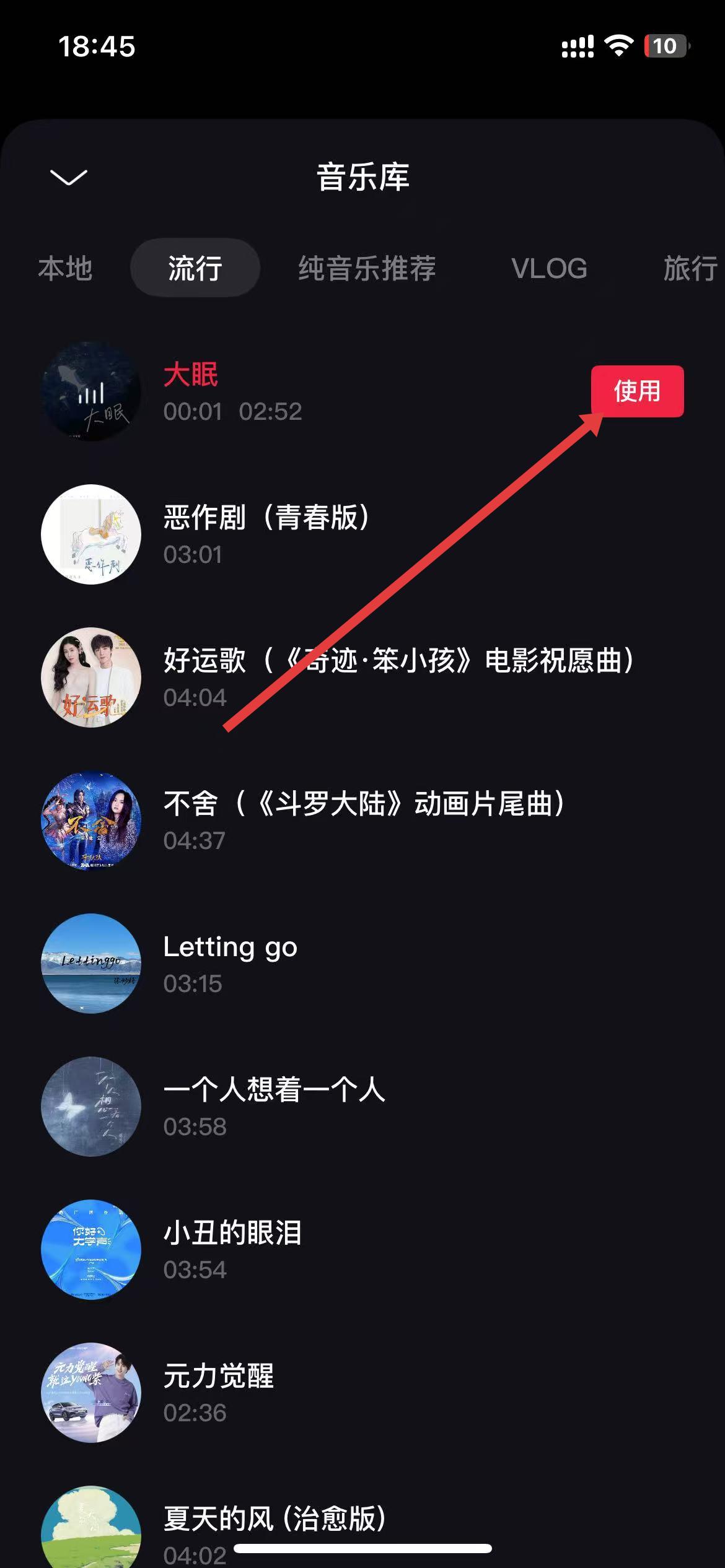 5、選擇自己需要的音樂,并點(diǎn)擊右側(cè)的使用按鈕,即可成功導(dǎo)入音樂。