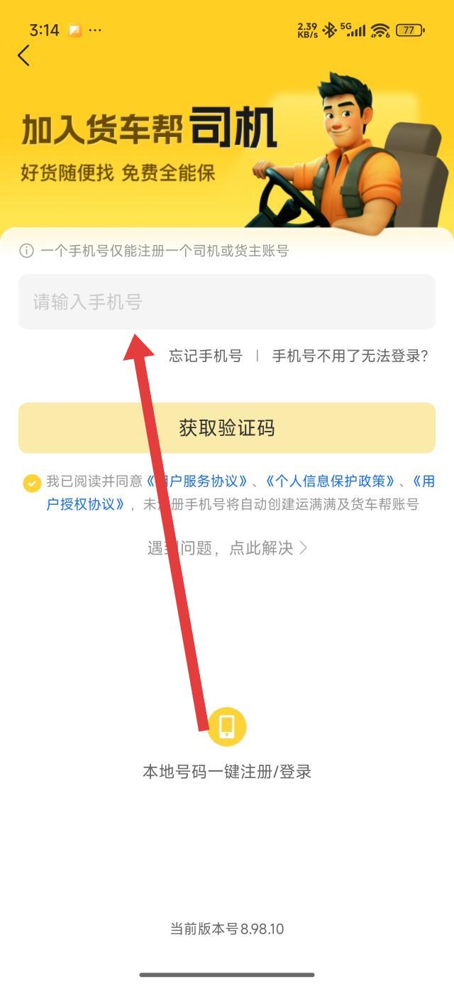 1、在貨車(chē)幫司機(jī)注冊(cè)界面,點(diǎn)擊請(qǐng)輸入手機(jī)號(hào)框,填寫(xiě)可用手機(jī)號(hào),完成注冊(cè)司機(jī)。