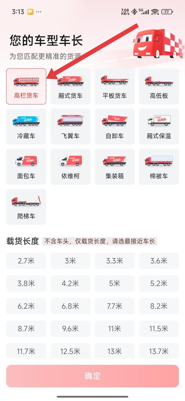 3、在車(chē)型車(chē)長(zhǎng)選擇頁(yè),可以選定高欄貨車(chē),再依據(jù)車(chē)輛載貨長(zhǎng)度,挑選最接近的尺寸,點(diǎn)擊確定后成功加入。