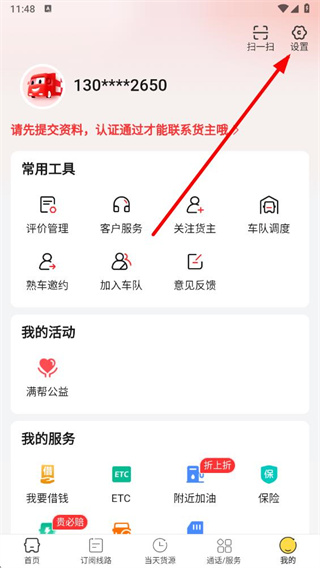 1、打開(kāi)貨車(chē)幫app,點(diǎn)擊底部導(dǎo)航欄中的我的選項(xiàng)。