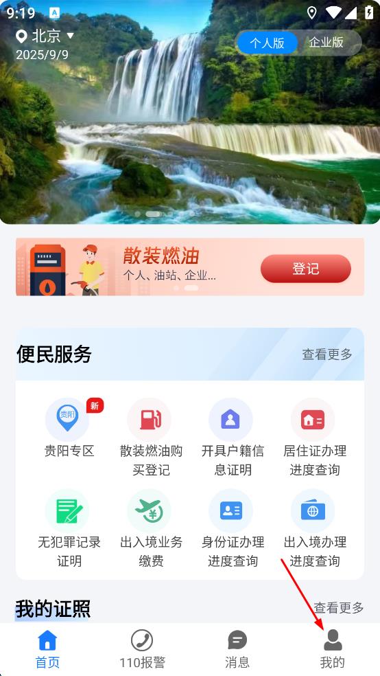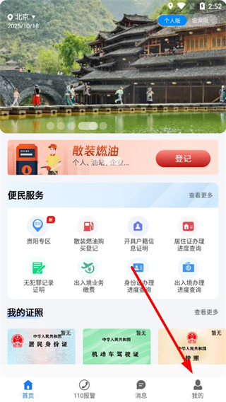 1、打開貴州公安app,點(diǎn)擊底部導(dǎo)航欄中的我的選項(xiàng)。
