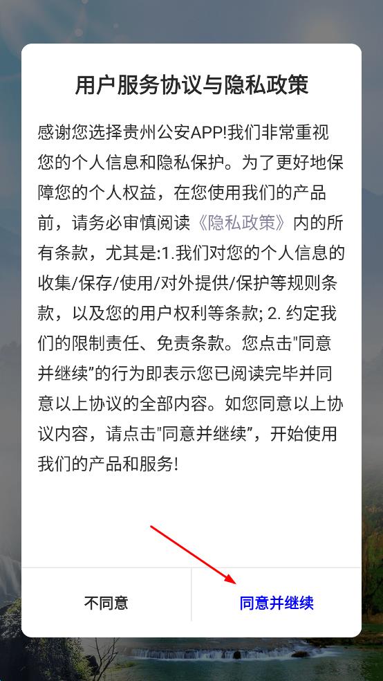 1、打開貴州公安APP,在彈出的用戶服務(wù)協(xié)議與隱私政策提示框中,點(diǎn)擊“同意并繼續(xù)”,進(jìn)入APP主界面。