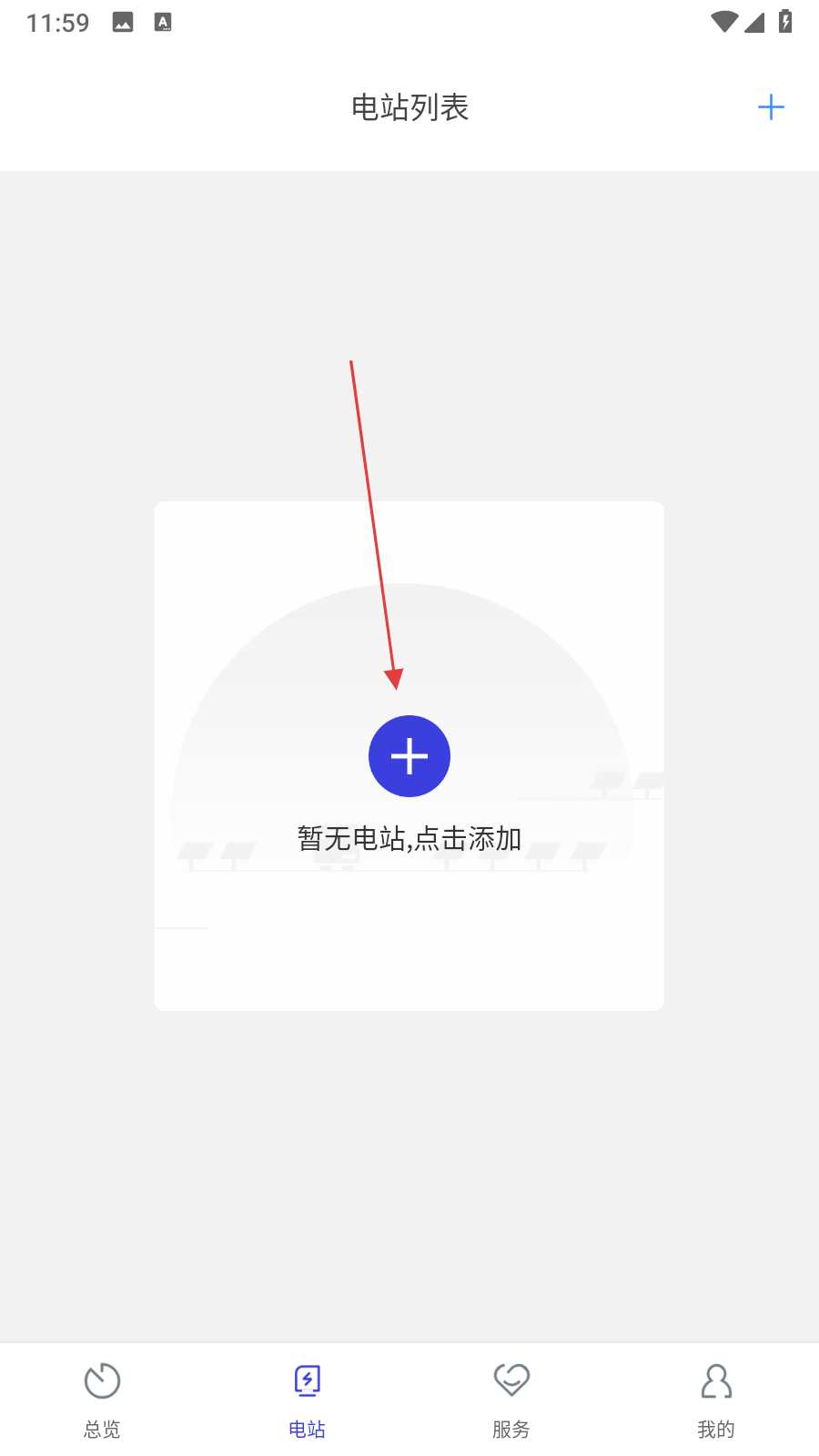 1、打開瑞光寶盒APP,進(jìn)入電站管理相關(guān)頁面,點(diǎn)擊+號添加電站。