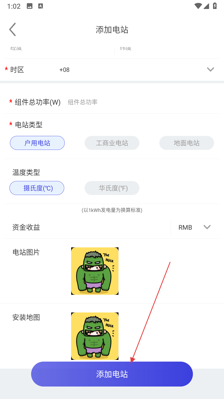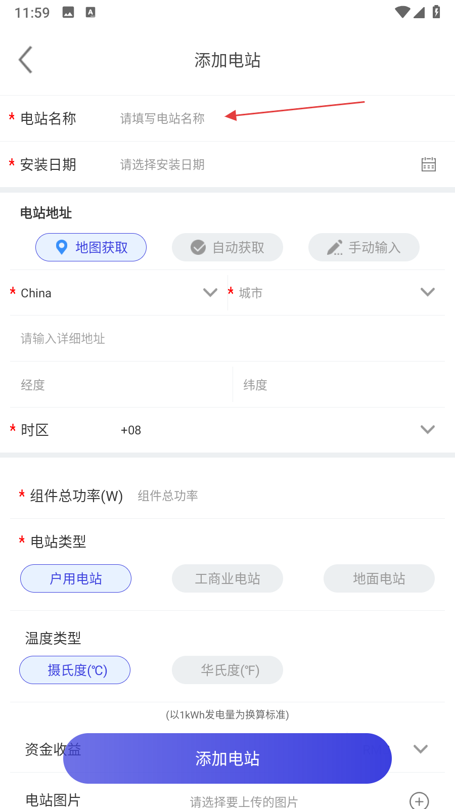 2、在添加電站頁面,填寫必填信息,包括電站名稱、安裝日期、電站地址、組件總功率、電站類型等。