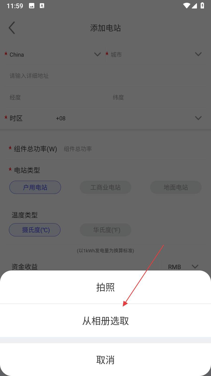 3、然后上傳電站圖片,可選擇拍照或從相冊選取,添加相關(guān)圖片。